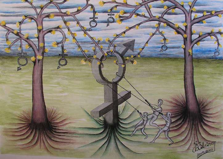 Os símbolos masculino e feminino juntos numa só estátua. A sociedade tenta derrubar, mas, no alto, outros nascem.